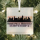 Glass ornament features skyline silhouette of Minneapolis MN with map coordinates on a watercolor splash background,