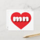 This postcard features a vibrant red heart containing the bold, white, rounded lower case letters mn, a playful abbreviation for Minnesota, the north star state. The reverse side of the card is blank, awaiting your customised text or handwritten sentiments.