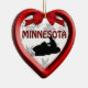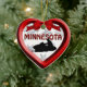 A graphic design of snowflakes and a snowmobile in a 3D style red frame on a heart shape Minnesota Christmas ornament. The ornament has text templates for your personalisation. ©2012charmainepaulson