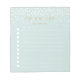 Chic personalised notepad features "to do list" at the top with your name beneath, in dark antique gold lettering on an ethereal pastel mint green background dotted with white confetti dots raining from the top. Keep track of all your important items with this lined to-do list note pad featuring 10 checkboxes.