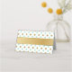 Pretty folded place card done in a mint green and gold on white small polka dot pattern. Graphics of a gold tone ribbon, runs across the front and back of the card. Personalise the custom text, on the back of the card to read what you want. Personalise the front of each card, by hand, for your wedding reception.