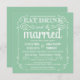 Eat, Drink, and be Married -- Elegant rustic style country wedding invitations -- Swirly, curly scrolls and old-fashion vintage typography in dazzling white lettering on pastel melon mint julep green background. Add the bride and groom names and wedding info in this easy to use template. Fancy, fun and whimsical, retro hand-written chalk style calligraphy can be modified for your formal or semi-formal wedding theme. Casual but classy modern style is perfect for trendy contemporary weddings with a touch of romantic sophisticated charm for traditional couples. Perfect for spring, summer or fall weddings. Please contact us for help with customisation if you need additional room for your wedding details. NOTE: Shown on standard A7 size invitation cards. Other sizes and styles available, along with matching postage stamps, coordinating bridal stationery, wedding packet accessories and shower favours.