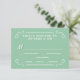 Eat, Drink, and be Married -- Vintage style rustic country wedding invitation personalised RSVP Response Cards -- Swirly, curly scrolls and old-fashion woodcut typography in radiant white on pastel melon mint green background. Add the bride and groom names and wedding and reply dates in this easy to use template. Elegant but fun and whimsical, retro hand-written style can be can be easily modified for your formal or semi-formal wedding themes. Casual modern country style is perfect for trendy rustic weddings with a fun touch of sophisticated charm for traditional couples. Please contact us for help with customisation if you need additional room for your wedding details. Other sizes and styles available, along with matching invitations, postage stamps, coordinating accessories and shower favours.