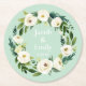 personalised names date wedding coasters, elegant outdoor chic cocktail reception, watercolor mint green white wreath, classic couple name typography floral, botanical rustic greenery round paper, modern rehearsal dinner foliage flowers, simple engagement party formal unique, minimalist anniversary celebration cute, bride groom spring autumn winter, custom couples shower fall summer