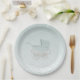 Glamourous and modern baby shower paper plate done in mint green with faux glitter. Graphics of a glittery mint green coloured baby carriage decorates the middle of the plate. Customise to add any text you want.