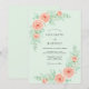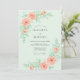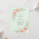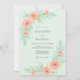 This design features a soft mint green backdrop adorned with lush watercolor peach roses and delicate leafy stems. The romantic palette of seafoam and apricot creates an airy, ethereal mood perfect for a spring or summer event. Elegant blooms and verdant foliage are arranged in a graceful composition that emphasizes a timeless botanical aesthetic.