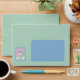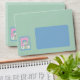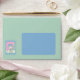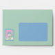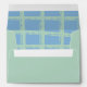 Cute mint green Holiday envelope featuring a cute little polar bear cub enjoying a cookie on the back and a blue and mint green grid pattern on the inside .