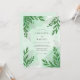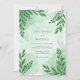 This design features a blend of soft mint and sage green watercolor washes for an airy atmosphere. Delicate illustrations of eucalyptus and willow foliage are layered over the artistic background for a fresh botanical look. This organic aesthetic is perfect for an outdoor spring or summer event. Deep emerald green accents add depth to the ethereal greenery.