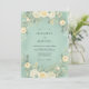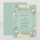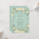 This design features a serene mint green background adorned with a lush watercolor arrangement of cream roses and white peonies. Delicate eucalyptus leaves, ferns, and tiny yellow blossoms create a soft botanical border that evokes a romantic woodland atmosphere. Perfect for an elegant spring or summer wedding, the palette offers a fresh and timeless aesthetic.