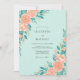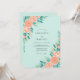This design features a soft mint green background adorned with vibrant peach watercolor roses. Delicate teal-hued foliage and eucalyptus leaves accent the edges, creating a fresh and airy botanical aesthetic. The romantic color palette of seafoam, coral, and emerald green is perfect for a breezy spring or summer event. Lush floral clusters bring a touch of natural elegance to this sophisticated and artistic composition.