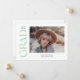 This stylish graduation announcement features the word grad in a mint green trendy serif along the left side. The front has space for a photo of the grad as well as their name, class year, and school. The back of the announcement has space for a second photo and a short message.