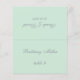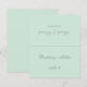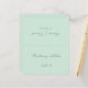 A simple mint green wedding place card with the guest name and the table number printed on its front and the bride and groom names and the wedding date printed on the other side (that is the other half, before folding it). All text is grey calligraphic script.