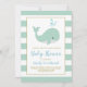 This sweet gender-neutral drive-by baby shower invitation features a cute mint green whale spouting blue water drops. The words "Baby Shower" and the customisable name of the mum-to-be appear in matching blue handwriting font. Beyond the faux gold rectangular frame is a background of mint green and white stripes. Ideal for a nautical, whale, or under-the-sea themed drive-through baby shower.