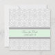 Wedding save the date announcement card with elegant light pastel mint green, grey and white floral damask pattern. Customisable with your wedding details, available in a wide range of matching wedding products. Contact us to request a colour change or a custom product.