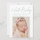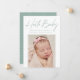 Modern birth announcement card featuring "Hello Baby" in a dark mint green signature script with your baby's name, birth stats, and photo displayed below. The photo birth announcement card reverses to display an additional photo and personal message with a mint and white polka dot background.