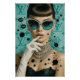 A chic pop-art portrait with vintage glamour: a poised woman in cat-eye sunglasses, pearl-sparkling jewelry, and opera gloves set against a teal luxury-monogram backdrop. Ink splatters, lipstick marks, and crisp graphic details blend fashion photography vibes with street-art attitude—perfect for a bold, stylish wall statement.