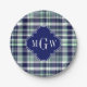 Mint Navy White Preppy Madras Quatrefoil Monogram Paper Plate