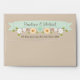 Add your names and address to this pretty custom rustic floral boho style envelope with a khaki sand coloured background and printed mint light green and jade ribbon look banner with a white cherry blossom branch, sunflower, brown eyed susan and aqua teal blue wild rose tulip and posy laurel wreath design. These envelopes perfectly compliment a bohemian chic, country western, farm, farmhouse, barn, barnyard or outdoor garden themed special occasion like a wedding, bridal or couples shower, engagement party, rehearsal dinner or anniversary celebration. Artwork and design © Chrissy H. Studios, LLC. All rights reserved.