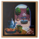 Table with teaset, mint tea glasses, oranges and courtyard - art depiction of life in Morocco