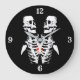 Mirror Image Skeletons Black Large Clock featuring conjoined skeletons sharing an anatomical heart surrounded by retro circus "sideshow" style numbers.