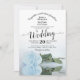 This beautiful wedding invitation features a photograph of a long stemmed light powder blue or dusty blue rose laying on its side reflecting in a pool of water with ripples and waves. The typography features an elegant script calligraphy and the wording is formal making this invitation both modern and classic. The back is a beautiful mottled blue-grey colour. This invite is optimised for the arch cut shape. Gorgeous way to invite your friends and family to share in your special day.