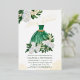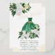 Emerald Green Quinceanera Invitation with green and gold princess gown and watercolor floral arrangements of white peony flowers and greenery. Mis Quince is lettered in gold foil swirly calligraphy and the remaining wording in elegant serif typography. Please see my Emerald Greenery & White Peony collection for matching items or, message me to create the templates you need.