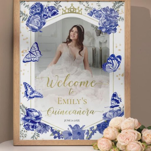 Capture the essence of your Quinceañera celebration with our tiara and butterflies-themed photo invitations. Create magical memories with watercolor royal blue floral designs intertwined with sparkling confetti, all housed within a modern geometric frame. These enchanting invites will set the tone for an unforgettable milestone celebration.