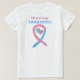 Miscarriage awareness uses a pink and blue ribbon for its cause awareness. The shirt art features a blue and pink awareness ribbon heart art painting. The awareness t-shirt message notes "Miscarriage Awareness". There is a large image on the back of the shirt and a smaller picture on the front of the shirt. The NIH explains pregnancy loss as "when a pregnancy ends unexpectedly before the 20th week. It is sometimes called early pregnancy loss, mid-trimester pregnancy loss, miscarriage, spontaneous abortion, or foetal demise." The NIH states "stillbirth refers to the death of a foetus at or after the 20th week of pregnancy."