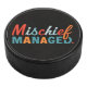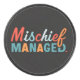 A playful and colourful design featuring the text "Mischief Managed" in a bold, playful font. The text is rendered in a vibrant, multi-colour palette, evoking a sense of fun and mischief.