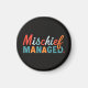 A playful and colourful design featuring the text "Mischief Managed" in a bold, playful font. The text is rendered in a vibrant, multi-colour palette, evoking a sense of fun and mischief.