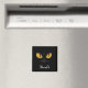 A cute and mischievous looking black cat with big almond shaped yellow orange eyes and cute little white fangs blending into a black background. Thanks written in a fancy white font.