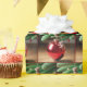 Two adorable mice are playfully perched on a shiny red Christmas ornament, which hangs from the branches of a green fir tree