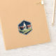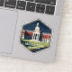 A hexagonal vintage travel badge inspired by Miskatonic University in Arkham, depicting dignified academic architecture in a classic retro travel poster style.