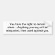 Bumper sticker with the statement "You have the right to remain silent....Anything you say will be misquoted, then used against you."