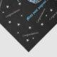 This tissue paper is shown with a celebratory print of stars, smaller sized congratulations scattered all over in Soft Grey on a black background with a larger Turquoise Blue congrautlations and Blue gleaming crown print with your personalised title and year. Must