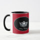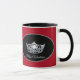 This two-tone mug has a black handle and black interior. Red background over white mug features ovals on each side with a silver-tone-colour pageant crown image in the centre of the ovals bordered by grey. Personalised text underneath each crown for you to customise. Text sample shown in "Miss Montana".