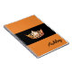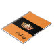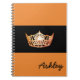 Notebook shown with a photo print of a gleaming Orange coloured crown print on a black background and a custom name. Orange notebook. Customise this item and change the name to yours or take off the name, or buy as shown.