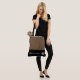 This cute stylish large tote bag is shown in a Brownie colour and Black colour block style with a pageant crown and custom text.