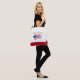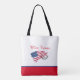 This cute stylish medium tote bag is shown in all White with a pageant crown and personalised text over an American Flag on an angle. Has bottom strip of Red with Royal/Navy Blue thinner stripe.