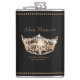 A bit of home comfort anywhere you go to celebrate in style. Bold Gold crown printed on front only, along with text for you to customise with your own. Gold coloured diamond pattern atop and bottom of flask. Silver, Black and Gold colourings. Miss America style crown.