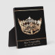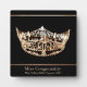 Shown in a 5x7" size this plaque is a real stand-up award for your pageant winners or contestants. Created in a sleek Black background with light Champagne-Biege text specifying the award of your choice which you can customise or buy as is changing the pageant name of course to your own. Plaque has stand attached and an image of a Miss America style crown in Gold. Scratch resistant coating makes this item a real winner.