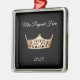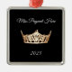 Christmas ornament is shown with a photo print of a gold crown on a black color background. Shown with red ribbon and is in a silver-colored premium metal. Customize this item with your personal pageant name, date or other with this template.