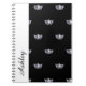 Notebook shown with a photo print of a sharp looking Silver coloured crown on a black background and a custom name. Notebook shown in a Black and White design. Customise this item and change the name to yours or take off the name and buy as is.