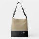 This cute stylish medium size cross body tote bag is shown in a Lark (tan) and Black colour block style with a pageant crown and handwritten custom text. Thin accent stripe.
