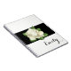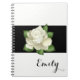 Notebook shown with a photo print of a White Rose print on a black background and a personalised name. Notebook shown in White, but choose your colour of background. Customise this item and change the name to yours or take off, or purchase as shown.