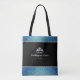 This tote bag is shown in two tone colour scheme. Faux blue and silver coloured glitter band at top and bottom with black strap handles. Black bag and on both sides is an attractive crown with white colour rounds-like-pearls. Sample text reads " Miss Washington State 2019".