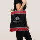 This tote bag is shown in two tone colour scheme. Faux red and silver coloured glitter band at top and bottom with black strap handles. Black bag and on both sides is an attractive crown with white colour rounds-like-pearls. Sample text reads " Miss Washington State 2019".