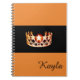 Notebook shown with a photo print of a gleaming Orange coloured crown print on a black background and a personalised name. Notebook shown in Orange. Customise this item and change the name to yours or take off, or purchase as shown.