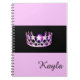 Notebook shown with a photo print of a gleaming Orchid coloured crown print on a black background and a personalised name. Notebook shown in Orchid. Customise this item and change the name to yours or take off, or purchase as shown.