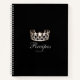 This spiral recipe notebook is shown in sleek Black with a print of a gleaming Silver crown on the cover and has great layout for your ease of adding in your own recipes. Beneath the crown is the word recipes in fancy script and the words Volume 1. Back cover in solid colour of Black with a small silver crown at bottom.